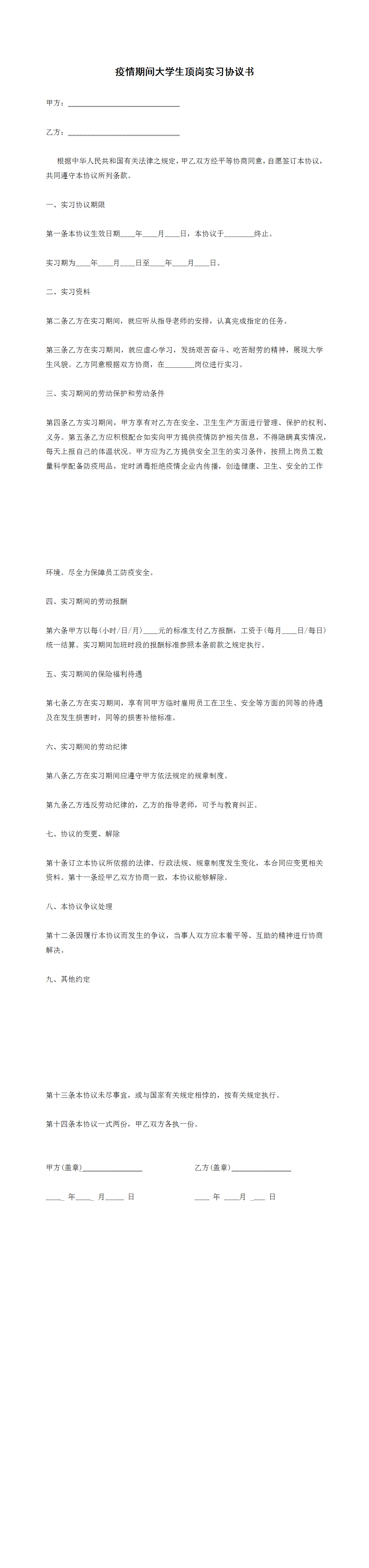 疫情期間大學(xué)生頂崗實(shí)習(xí)協(xié)議書