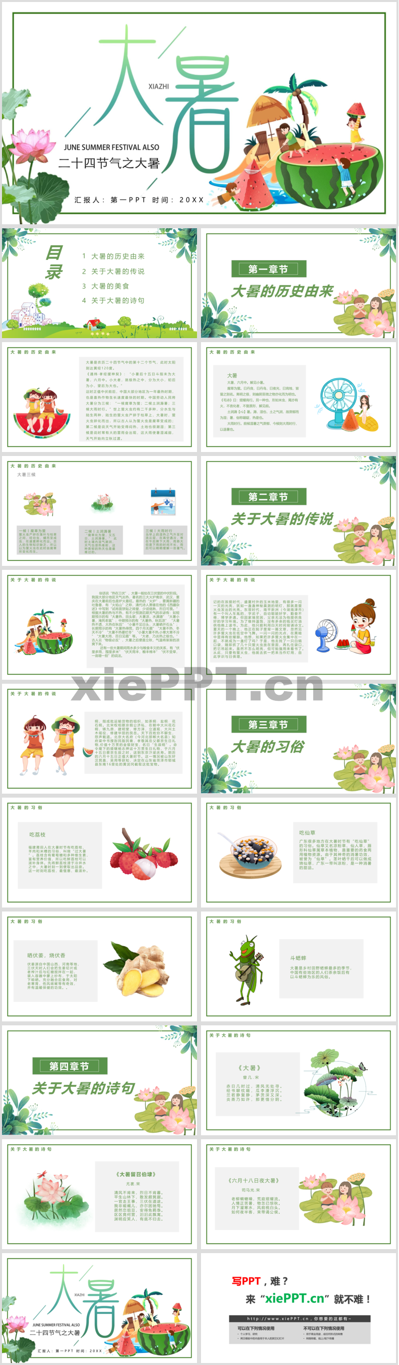 卡通荷花大西瓜背景的大暑節(jié)氣介紹PPT模板